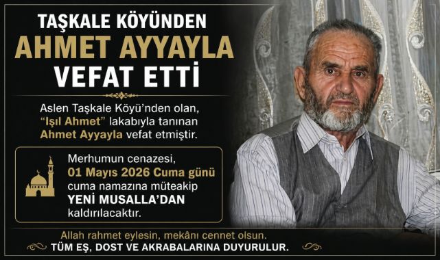 Aslen Taşkale Köyü’nden olan, “Işıl Ahmet” lakabıyla tanınan Ahmet Ayyayla vefat etmiştir.Merhumun cenazesi, 01 Mayıs 2026 Cuma günü cuma namazına müteakip Yeni Musalla’dan kaldırılacaktır.Allah rahmet eylesin, mekânı cennet olsun.
