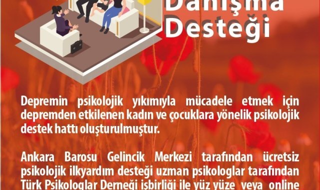 Ankara Barosu tarafından depremin psikolojik yıkımıyla mücadele edilmesi için destek hattı oluşturuldu. Ankara Barosu tarafından depremin psikolojik yıkımıyla mücadele etmek için depremden etkilenen kadın ve çocuklara yönelik psikolojik destek hattı oluşturuldu.
