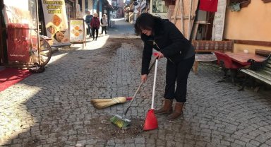 İnşaatın oluşturduğu pislikleri esnaf süpürgelerle temizlemeye çalıştı