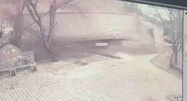 Boş araziye uçan yardım tırı kazası güvenlik kamerasına yansıdı