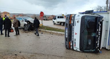 Otomobille çarpışan kamyon yan yattı