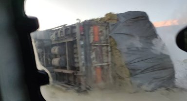 Kop Dağı'nda saman yüklü kamyon devrildi sürücünün burnu bile kanamadı