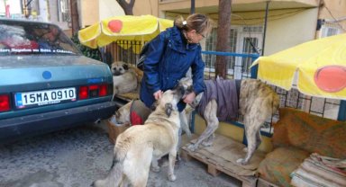 Kulübeleri kaldırılan sokak köpeklerini altlarına kilim serip yelek giydirerek soğuktan korudu