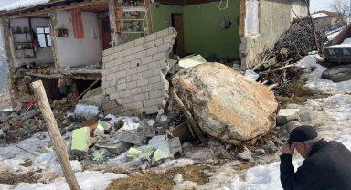 Depremde dağdan kopan kayalar evlerin üzerine düştü