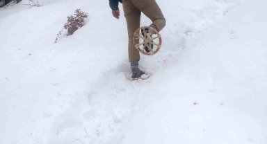 Kastamonu'da 15 gündür kardan dolayı yolu kapalı olan köylüler, ayaklarına giydikleri gigile ile ilaçlarını alabiliyor