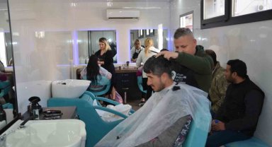 Depremzedelere mobil kuaförle hizmet verilmeye devam ediliyor