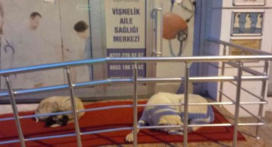Vişnelik Aile Sağlığı Merkezi önünde sevimli köpekler geceleri nöbet bekliyor