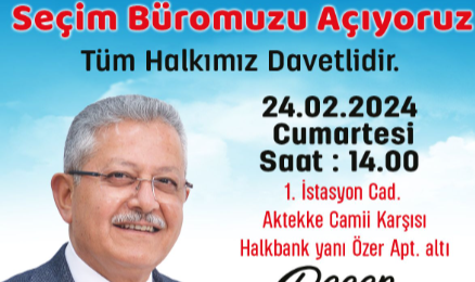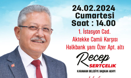Cumhuriyet Halk Partisi Karaman Belediye başkan Adayı Recep SERTÇELİK, seçim çalışmalarında kullanacağı Seçim Bürosunu açıyor. SERTÇELİK’in Seçim Bürosu 1. İstasyon Caddesi Aktekke Camisi karşısında, Halk Bankası bitişiğindeki Özer Apartmanı alt katında, 24 Şubat Cumartesi saat 14.00’de açılacak. Tüm Karaman halkını açılışa davet eden SERTÇELİK, “büromuz, seçim süreci boyunca halkımızla buluşup, ortak aklı oluşturacağımız mekan olacaktır” dedi.--