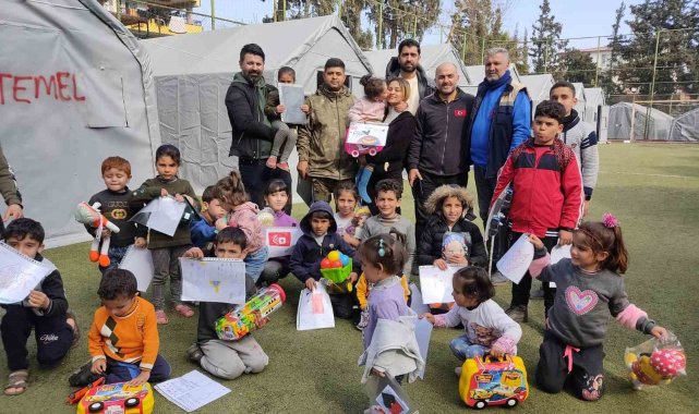 Kahramanmaraş merkezli depremlerde en çok etkilenen illerden olan Hatay'da askerler depremzede çocuklara oyuncak vererek sevindirdi.