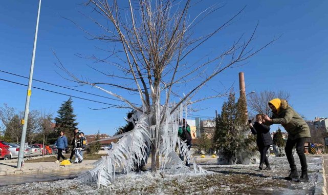 Eskişehir'de sulama sistemlerinin açılması soncunda oluşan buz sarkıtları güzel görüntüler oluştururken, oradan geçen vatandaşlar donan ağaçları fotoğraflamayı ihmal etmedi.