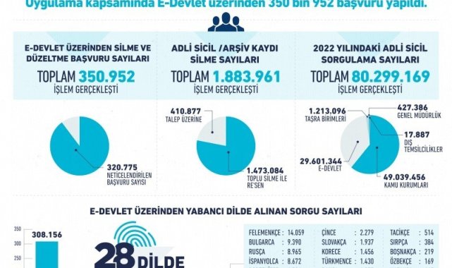 Adalet Bakanlığı'nın dijital dönüşüm çalışmaları çerçevesinde başlatmış olduğu adli sicil kaydı düzeltme ve silme taleplerinin e-Devlet'ten alınması uygulaması yoğun ilgi gördü. Adalet Bakanı Bekir Bozdağ tarafından 18 Ağustos'ta başlatılan, bugüne kadar 350 bin 952 başvuru yapılan uygulamada 320 bin 775 adli sicil kaydı silindi.