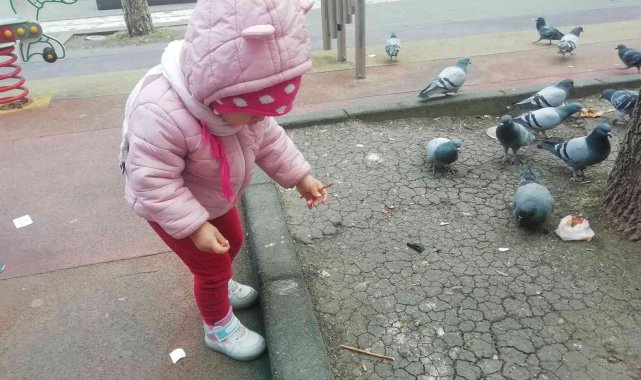 Eskişehir'de ailesinin parka getirdiği minik Leyla, elindeki çubuk krakeri güvercinlerle paylaştı.