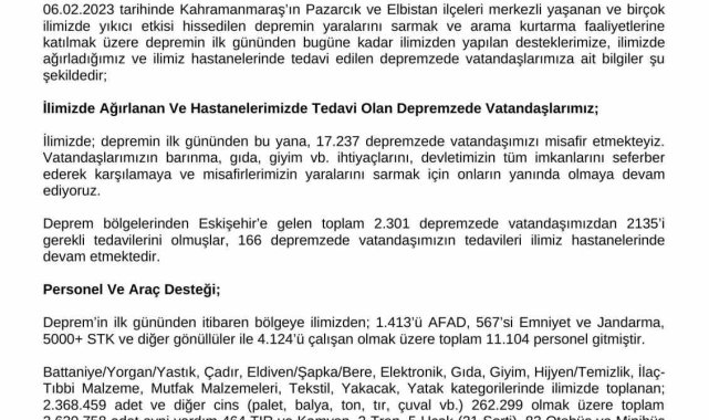 Eskişehir Valiliği, Kahramanmaraşlı merkezli depremlerin ardından 17 bin 237 depremzedenin şehirde misafir edildiğini açıkladı. Eskişehir Valiliği sosyal medya üzerinden yaptığı açıklamada, büyük yıkıma neden olan depremlerin ardından Eskişehir'de misafir edilen ve tedavi altına alınan depremzedeler hakkında bilgi verdi. Merkez üssü Kahramanmaraş olan ve 11 ilde büyük yıkıma yol açan 7.7 ve 7.6 büyüklüğündeki depremler sonrasında ilk günden itibaren arama kurtarma faaliyetlerine destek verildiği belirtilirken, Eskişehir'e toplamda 17 bin 237 depremzedenin geldiği açıklandı. Deprem bölgelerinden gelen vatandaşlardan toplam 2 bin 301 depremzededen 2 bin 135'inin tedavilerinin tamamlandığı belirtilerek, 166 depremzedenin ise tedavilerinin Eskişehir'deki hastanelerde sürdüğü ifade edildi. Yapılan açıklamada, "İlimizde, depremin ilk gününden bu yana 17 bin 237 depremzede vatandaşımızı misafir etmekteyiz. Vatandaşlarımızın barınma, gıda, giyim vb. ihtiyaçlarını, devletimizin tüm imkanlarını seferber ederek karşılamaya ve misafirlerimizin yaralarını sarmak için onların yanında olmaya devam ediyoruz. Deprem bölgelerinden Eskişehir'e gelen toplam 2 bin 301 depremzede vatandaşımızdan 2 bin 135'i gerekli tedavilerini olmuşlar, 166 depremzede vatandaşımızın tedavilerini ilimiz hastanelerinde devam etmektedir" ifadeleri kullanıldı.