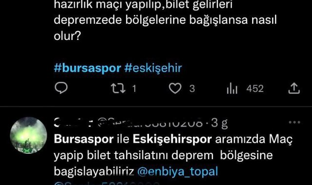 Eskişehirspor taraftarları, yakın zamanda Bursaspor ile bir hazırlık maçı düzenlenmesi ve elde edilecek gelirin depremzedelere bağışlanması için sosyal medya üzerinden çağrıda bulundu.