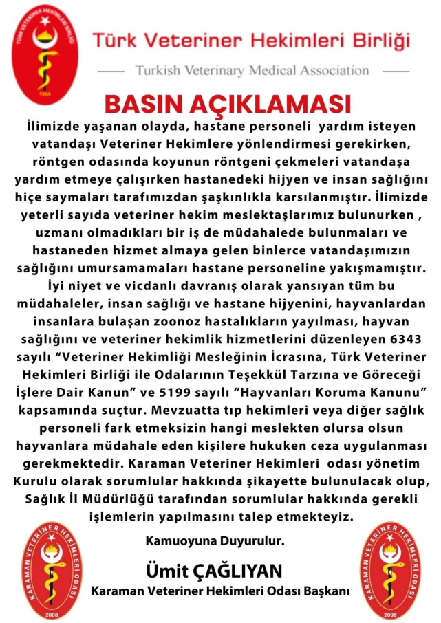 Olayın ardından Karaman Veteriner Hekimleri Odası’ndan konuya ilişkin bir basın açıklaması geldi. Oda Başkanı Ümit Çağlıyan tarafından yapılan açıklamada, hastane personelinin vatandaşı veteriner hekime yönlendirmesi gerekirken, koyunun röntgen odasında görüntülenmesi ve tıbbi müdahaleye kalkışılması eleştirildi.Çağlıyan açıklamasında, “İlimizde yeterli sayıda veteriner hekim varken, uzmanı olmadıkları bir alanda müdahale etmek, hastaneye gelen binlerce vatandaşın sağlığını hiçe saymaktır” dedi. Ayrıca bu tür müdahalelerin hem hijyen açısından insan sağlığını tehdit ettiğini hem de zoonoz hastalıkların yayılmasına neden olabileceğini belirtti.Veterinerlik mesleğinin icrası ve hayvan sağlığıyla ilgili işlemlerin 6343 sayılı "Veteriner Hekimliği Mesleğinin İcrasına Dair Kanun" ve 5199 sayılı "Hayvanları Koruma Kanunu" ile düzenlendiğini hatırlatan Çağlıyan, bu yetki dışı müdahalelerin hukuken suç teşkil ettiğini ifade etti.Çağlıyan, Karaman İl Sağlık Müdürlüğü’nden de sorumlular hakkında gerekli işlemlerin yapılmasını talep ettiklerini belirterek, kamuoyunu bilinçli davranmaya davet etti.Çağlıyan yayınladığı basın açıklamasında şu ifadelere yer verdi: "İlimizde yaşanan olayda, hastane personeli yardım isteyen vatandaşı Veteriner Hekimlere yönlendirmesi gerekirken, röntgen odasında koyunun röntgeni çekmeleri vatandaşa yardım etmeye çalışırken hastanedeki hijyen ve insan sağlığını hiçe saymaları tarafımızdan şaşkınlıkla karşılanmıştır. İlimizde yeterli sayıda veteriner hekim meslektaşlarımız bulunurken, uzmanı olmadıkları bir işe müdahalede bulunmaları ve hastaneden hizmet almaya gelen binlerce vatandaşımızın sağlığını umursamamaları hastane personeline yakışmamıştır.İyi niyet ve vicdanlı davranış olarak yansıyan tüm bu müdahaleler, insan sağlığı ve hastane hijyenini, hayvanlardan insanlara bulaşan zoonoz hastalıkların yayılması, hayvan sağlığını ve veteriner hekimlik hizmetlerini düzenleyen 6343 sayılı “Veteriner Hekimliği Mesleğinin İcrasına, Türk Veteriner Hekimleri Birliği ile Odalarının Teşekkül Tarzına ve Göreceği İşlere Dair Kanun” ve 5199 sayılı “Hayvanları Koruma Kanunu” kapsamında suçtur. Mevzuatta tıp hekimleri veya diğer sağlık personeli fark etmeksizin hangi meslekten olursa olsun hayvanlara müdahale eden kişilere hukuken ceza uygulanması gerekmektedir. Karaman Veteriner Hekimleri odası yönetim kurulu olarak sorumlular hakkında şikayette bulunulacak olup, Sağlık İl Müdürlüğü tarafından sorumlular hakkında gerekli işlemlerin yapılmasını talep etmekteyiz. Kamuoyuna Duyurulur."