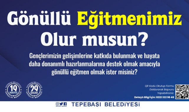 Yeni dönemde de Gençlik Merkezleri ile birlikte çalışıp eğitimlere destek verecek gönüllü eğitmenler aranıyor. Deneyim paylaşımı ve akran eğitimi modeli ile sürdürülen bu çalışmada eğitmenler, kendilerini yeterli bulduğu konularda atölye çalışmaları ve/veya eğitimler düzenleyebiliyor. Gönüllü eğitmen olmak isteyenler, online başvuru için duyuru afişinde ve Gençlik Merkezleri'nin "esktgm" adlı sosyal medya hesaplarından paylaşılan QR kodu okutarak başvuru formuna ulaşabiliyor.