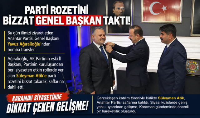 Ağıralioğlu, AK Parti’nin eski İl Başkanı ve partinin kuruluşundan bu yana siyasette aktif görevlerde bulunan Süleyman Atik’e parti rozetini bizzat taktı.Gerçekleşen katılım töreniyle birlikte Süleyman Atik, Anahtar Partisi saflarına katıldı. Siyasi kulislerde geniş yankı uyandıran gelişme, Karaman gündeminde önemli bir hareketlilik oluşturdu.