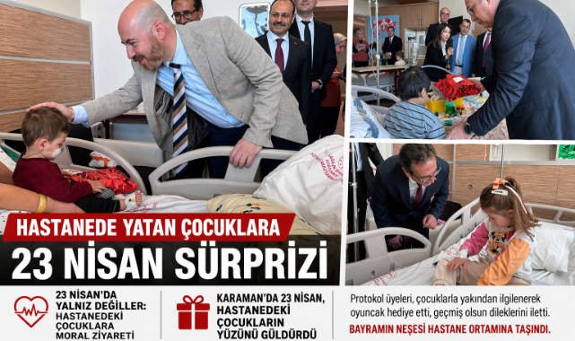 Karaman’da 23 Nisan, Hastanedeki Çocukların Yüzünü Güldürdü23 Nisan Ulusal Egemenlik ve Çocuk Bayramı dolayısıyla Karaman Eğitim ve Araştırma Hastanesi çocuk servisinde yatan minikler, gerçekleştirilen ziyaretle bayram sevincini yaşadı.İl Millî Eğitim Müdürümüz Mehmet Çalışkan, İl sağlık Müdürü Dr. Mehmet Serkan Yurdakul ve Aile ve Sosyal Hizmetler İl Müdürü Nurettin Ulaş, Başhekim Dr. Öğretim Üyesi Şükrü Salih Toprak ile birlikte çocuk servisinde yatan minikleri ziyaret etti. Bayramı hastanede geçirmek durumunda kalan çocuklarla yakından ilgilenen protokol üyeleri, onların mutluluğuna ortak olarak moral verdi.Ziyaret sırasında çocukların sağlık durumları hakkında ailelerinden bilgi alınırken, geçmiş olsun dilekleri iletildi. Miniklere çeşitli oyuncaklar hediye edilerek bayramın neşesi hastane ortamına taşındı.İl Millî Eğitim Müdürümüz Mehmet Çalışkan, yaptığı açıklamada, 23 Nisan’ın tüm çocuklar için özel bir anlam taşıdığını vurgulayarak, bu anlamlı günde hastanede tedavi gören çocukları yalnız bırakmak istemediklerini ifade etti. Çalışkan, tüm çocukların bayramını kutlayarak sağlık ve mutluluk temennisinde bulundu.Ziyaret, çocukların yüzlerinde oluşan tebessümle anlam kazanırken, günün anısına çekilen hatıra fotoğraflarıyla sona erdi.