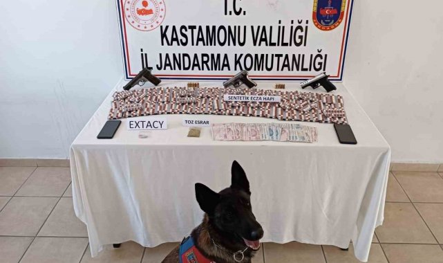 Edinilen bilgiye göre, Kastamonu İl Jandarma Komutanlığı ekiplerince uyuşturucu madde ticaretinin önlenmesine yönelik gerçekleştirilen çalışmalar neticesinde, İstanbul'dan Kastamonu'nun Tosya ilçesine piyasaya sürmek üzere uyuşturucu madde getirdikleri tespit edilen A.B. ve H.Y. isimli şahısların üzerinde ve evlerinde uyuşturucu madde arama köpeği 'Yekten' ile arama yapıldı. Yapılan aramada bin 787 adet sentetik hap, 15 gram toz esrar, 7 adet extacy hap, 3 adet ruhsatsız tabanca ve 19 adet fişek ele geçirildi.