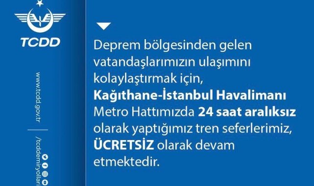 TCDD'den yapılan paylaşımda, "Deprem bölgesinden gelen vatandaşlarımızın ulaşımını kolaylaştırmak için, Kağıthane - İstanbul Havalimanı Metro hattımızda 24 saat aralıksız olarak yaptığımız tren seferlerimiz ücretsiz olarak devam etmektedir" denildi.