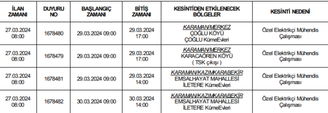 KARAMAN-2 İşletmesi sorumluluk alanı içerisinde yer alan aşağıda bilgileri belirtilen bölgelerde yapılacak çalışmalar nedeniyle programlı elektrik kesintisi yapılacaktır. Çalışmaların programlanan süreden erken tamamlanması halinde kesinti bitiş saatinden önce elektrik verilebilecektir.