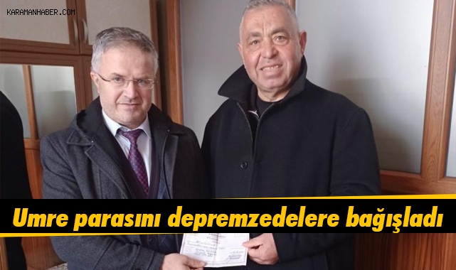 Ermenek ilçesine bağlı Güneyyurt beldesinde esnaflık yapan İbrahim Öztürk da örnek teşkil edecek bir davranışa imza attı. Öztürk, umreye gitmekten vazgeçerek parasını depremzedelere bağışladı. Ermenek İlçe Müftülüğünün sosyal medya hesabı üzerinden konuyla ilgili olarak yapılan paylaşımda, "İlçemiz Güneyyurt kasabasından esnaf İbrahim Öztürk abimiz umre parasını depremzede kardeşlerimiz için bağışladı. Umreye gitme kararından vazgeçip depremde yaraları sarmak için bağışta bulunan abimizden Rabbim razı olsun. İnşallah Rabbim niyetine aldığı umre sevabını verir. Benzer örnek teşkil edecek bağışçılarımızın sayısını Rabbim arttırsın” ifadelerine yer verdi.