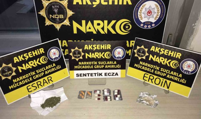 Edinilen bilgiye göre, Konya Narkotik Suçlarla Mücadele Şube Müdürlüğü ile Akşehir Narkotik Şube ekipleri gençleri zehirlemek için uyuşturucu sevkiyatı ve sokak satıcılığı yapan şahısların tespitine yönelik çalışmalarını sürdürüyor. Polis ekipleri, Akşehir'e çevre illerden uyuşturucu madde getirileceği yönünde aldığı istihbarı bilgiler üzerine tespit edilen 3 araçta arama yaptı. Araçlarda yapılan aramalarda 2 kilo 80 gram esrar, 13 sentetik ecza, 3 gram metamfetamin, bir miktar eroin ile bin 500 TL suç geliri para ele geçirildi.