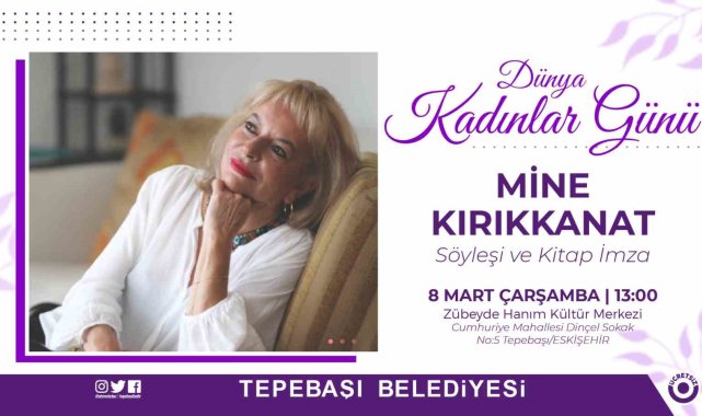 Tepebaşı Belediyesi, gazeteci, yazar ve köşe yazarı Mine Kırıkkanat'ı okurlar ile buluşturacak. 8 Mart Dünya Emekçi Kadınlar Günü dolayısıyla düzenlenecek söyleşi ve kitap imza etkinliğinde Kırıkkanat, Eskişehirliler ile bir araya gelecek. Katılımın ücretsiz olacağı söyleşi ve kitap imza etkinliği, 8 Mart Çarşamba günü saat 13.00'te Zübeyde Hanım Kültür Merkezi ev sahipliğinde yapılacak.
