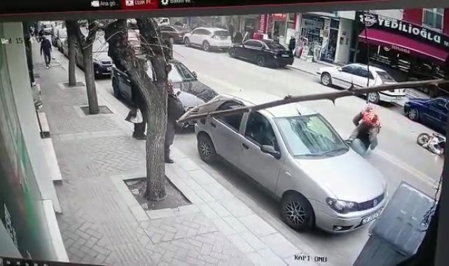 Eskişehir'de içerisinde bulunduğu iş yerinin önünden motosikletini çalan hırsızın peşinden tostla koşan iş yeri sahibinin, dengesini bozarak düşürdüğü hırsızı üstüne atlayarak yakaladığı anlar güvenlik kameralarına yansıdı.Güllük Mahallesi Alaç Sokak'taki iş yerinde tost satan Suat Aktaş, paket servisini de motosikletiyle kendisi yapıyor. Siparişi hızlı ulaştırmak için motosikletinin anahtarını üzerinde bırakan Aktaş'ın aracı, tost hazırladığı sırada iş yerinin önünden çalındı. Elinde tostla motosikletinin peşinden koşan Aktaş, bir süre kovaladığı hırsızın dengesini bozarak motosikletten düşmesini sağladı. Düşmenin etkisiyle yerde hırsızla birlikte sürüklenen Aktaş, kaçmaya çalışan hırsızı üstüne atlayarak yakaladı. Olayın gerçekleştiği anlar sokak güvenlik kameralarınca kaydedildi."Biri şaka yapıyor sandım"Motosikletinin çalınma anını anlatan iş yeri sahibi Suat Aktaş, "Dükkânda tek başıma duruyordum. Paketim hazır olmak üzereydi, ben de dükkânı kapatıp çıkacaktım. Hızlı olsun diye motorun üzerine anahtarımı bıraktım ve içeriye paketi almaya girdim. Tam paketi hazırlarken motosikletin çalıştığını fark ettim. Birisi şaka yapıyor sandım ve kapıdan baktığım zaman hiç tanımadığım birisi vardı. Beni görünce o da panikledi. Gaza basıp kaçmaya çalıştı. Ben de motosikletin arka çantasındaki lastiklerden çekerek dengesini kaybettirdim. Sonrasında lastik kopunca yerde biraz sürüklendim. Sonra o da dengesini kaybetti ve motosikletle birlikte caddeye doğru sürüklendik. Orada da üstüne atlayarak etkisiz hale getirdim ve polislerin gelmesini bekledim" şeklinde konuştu."İki tane de çocuğum var ben motorun peşinden koşarken onları düşündüm"Hırsızın peşinden koştuğu anlarda çocuklarını düşündüğünü söyleyen Aktaş, "Sonuçta burada esnafız, para kazanıyoruz. Yeri geldi kuryelik yaptım ve şimdi de dükkân açtım. Burası ekmek teknesi. İki tane de çocuğum var, ben motorun peşinden koşarken onları düşündüm. Elimde tostla koşuyordum. Buradaki çoğu kurye arkadaşla tanışıyoruz. İlk önce ben hırsızı dövüyorum sandılar. İnsanlar bana tepki gösterdi, ama sağ olsunlar kuryeler dayanışma halinde olduğu için sokakta gören diğer arkadaşlar gelip yardım etti" dedi.