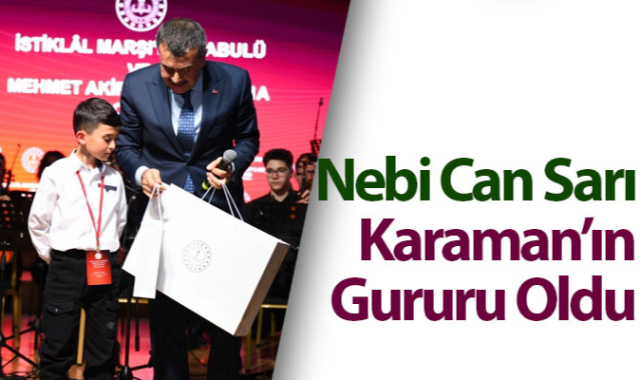 Ortaokullar arasında düzenlenen "İstiklal Marşını Güzel Okuma" yarışmasında, Karaman’ı temsil eden Dr. Faruk Sükan Ortaokulu 7. sınıf öğrencisi Nebi Can Sarı, Türkiye üçüncüsü olarak ilimize büyük bir başarı kazandırdı.Millî Eğitim Bakanı Yusuf Tekin’in katılımıyla, CSO Ada Ankara Tarihî Salon'unda gerçekleştirilen "İstiklal Marşı'nın Kabulü ve Mehmet Akif Ersoy'u Anma Günü" programında ödülünü aldı. Nebi Can, ilimizdeki yarışmada birinci olarak Ankara'da yapılan elemelerde de başarı gösterdi. İstanbul, İzmir, Kayseri, Niğde, Kastamonu, Bayburt ve Gaziantep gibi şehirlerin yarıştığı finallerde yapılan değerlendirmede Türkiye üçüncüsü olmayı başardı.Ödülünü Milli Eğitim Bakanı Yusuf Tekin’in elinden alan Nebi Can Sarı, Karaman’ın gururu oldu. Kendisiyle gurur duyuyor ve başarısını tebrik ediyoruz.