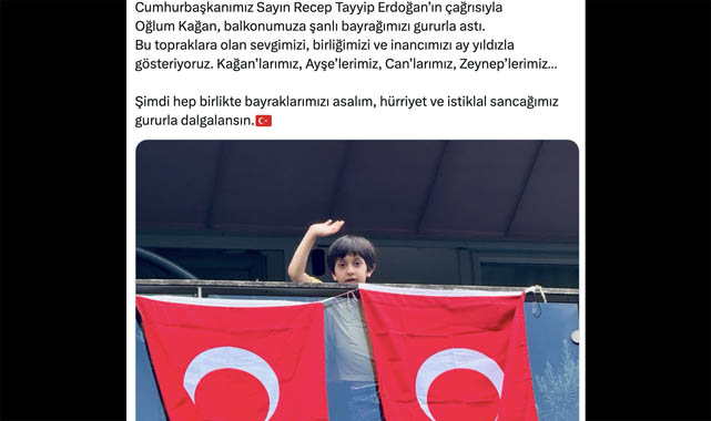 Paylaşımında “Cumhurbaşkanımız Sayın Recep Tayyip Erdoğan’ın çağrısıyla oğlum Kağan, balkonumuza şanlı bayrağımızı gururla astı” ifadelerine yer veren Özdemir, birlik ve beraberlik mesajı verdi. “Bu topraklara olan sevgimizi, birliğimizi ve inancımızı ay yıldızla gösteriyoruz” diyen Özdemir, vatandaşları da bayrak asmaya davet etti.