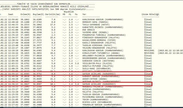 Kandilli Rasathanesi ve Deprem Araştırma Enstitüsü (KRDAE) Bölgesel Deprem-Tsunami İzleme ve Değerlendirme Merkezi (BDTİM) tarafından bugün 11.36'da Samsun açıklarında Karadeniz'de 10,1 km derinlikte 3,4, saat 11.55'te 8 km derinlikte 3,6 büyüklüğünde iki deprem kaydedildi.