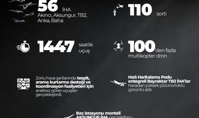 Merkez üssü Kahramanmaraş olan ve 10 ili etkileyen 7,7-7,6 büyüklüğündeki depremlerin ardından Türk İHA'lar havadan arama-kurtarma çalışmalarına destek için aralıksız görev yaptı. SSB sosyal medya hesabı üzerinden yaptığı paylaşımda, 56 adet İHA'nın (Akıncı, Aksungur, TB2, Ankara ve Baha), toplamda bin 447 saatlik uçuş, 110 sorti, 100 den fazla multikopter dronun zorlu hava şartlarında tespit arama kurtarma desteği ve koordinasyon faaliyetleri için aralıksız görev uçuşları gerçekleştirdiği belirtildi. Ayrıca Hızlı Haritalama Podu entegreli Bayraktar TB2 İHA'lar havadan yüksek çözünürlüklü görüntü aldı. Baz istasyonu monteli Aksungur İHA cep telefonu iletişimine önemli katkı sundu.
