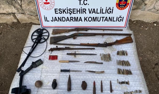 Eskişehir'de tarihi eser kaçakçılığı yaptığı belirlenen bir şüphelinin evinde el bombası, boş uçaksavar mermisi, uzun namlulu silah mermisi ve top güllesi gibi tehlikeli maddeler ele geçirildi. Eskişehir İl Jandarma Komutanlığı Kaçakçılık ve Organize Suçlarla Mücadele Şube Müdürlüğü (KOM) ekiplerince, Tepebaşı ilçesine bağlı Satılmışoğlu mahallesinde ikamet eden bir şahsın tarihi eser kaçakçılığı yaptığı ve evinde tehlikeli madde bulundurduğu bilgisi alındı. KOM ve Çukurhisar Jandarma Karakol Komutanlığı ekiplerince şahsın ilçe merkezi ve Satılmışoğlu Mahallesi'ndeki ikametlerinde arama yapıldı. Aramalarda; 2 adet savunma tipi el bombası, 40 adet dolu uzun namlulu silah fişeği, 2 adet barutsuz uçaksavar fişeği, 1 adet 17 santimetre çapında dolu fişek, 13 adet dolu kısa namlulu silah fişeği, 65 adet boş kovan, 1 adet top güllesi, 5 adet hançer, 1 adet metal dedektörü, 6 adet av tüfeği fişeği, 3 adet av tüfeği, 1 adet mekanizmalı eski tip namlu ele geçirildi.