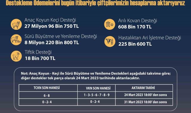 Eskişehir'de tarımsal faaliyet gösteren şahıs ve işletmelere destek amacıyla yapılacak olan 36 milyon liralık ödeme, hesaplara aktarılmaya başladı.Farklı tarımsal alanlarda faaliyet gösteren şahıs ve işletmelere verilmesi planlanan 36 milyon 170 bin 20 TL'lik ödeme, hesaplara aktarılmaya başladı. Eskişehir'de 5 farklı iş kolunda faaliyet gösteren 6 bin 25 üretici ve işletmeye toplamda 36 milyon 170 bin 20 TL ödeme yapılacak.Başlayan destek ödemeleri hakkında açıklama yapan İl Tarım ve Orman Müdürü Ender Muhammed Gümüş, şu ifadeleri kullandı:"Eskişehir'de 36 Milyon 170 bin 20 TL tarımsal destekleme ödemesini bugün itibariyle üreticilerimize ödüyoruz. 'Anaç Koyun Keçi Desteği' için 4 bin 217 yetiştiricimize 27 milyon 96 bin 750 TL, 'Sürü Büyütme ve Yenileme Desteği' için bin 454 yetiştiricimize 8 milyon 220 bin 800 TL, 'Tiftik Desteği' için 29 yetiştiricimize 18 bin 700 TL, 'Arılı Kovan Desteği' için 318 İşletmeye 608 bin 170 TL, 'Hastalıktan Ari İşletme Desteği' için 7 işletmeye 225 bin 600 TL olmak üzere toplamda 36 Milyon 170 bin 20 TL destekleme ödemesini bugün itibariyle üreticilerimizin hesaplarına aktarıyoruz. Hayırlı bereketli olsun."