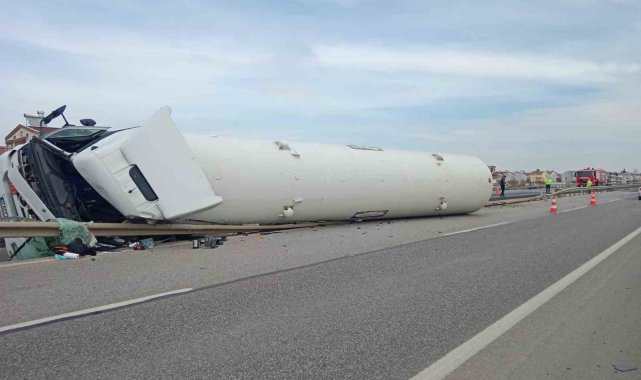 Tekirdağ'da seyir halindeki doğalgaz yüklü tanker devrilirken aracın sürücüsü yaralandı.