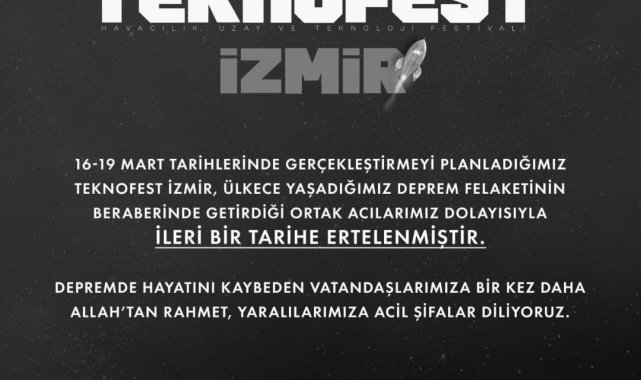 TEKNOFEST'in sosyal medya hesabından yapılan paylaşımda, "16-19 Mart tarihlerinde gerçekleştirmeyi planladığımız TEKNOFEST İZMİR, ülkece yaşadığımız deprem felaketinin beraberinde getirdiği ortak acılarımız dolayısıyla ileri bir tarihe ertelenmiştir. Depremde hayatını kaybeden vatandaşlarımıza bir kez daha Allah'tan rahmet, yaralılarımıza acil şifalar diliyoruz" denildi.