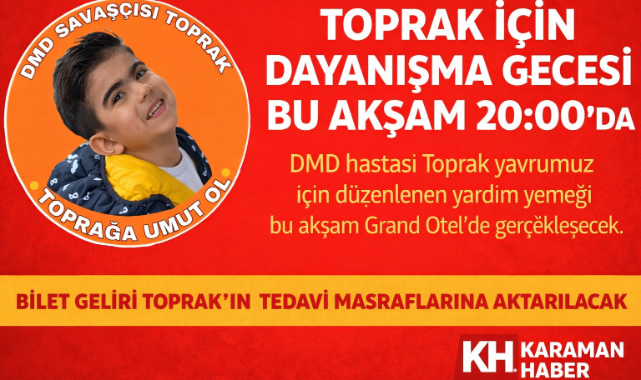 Karaman’da DMD hastalığı ile mücadele eden Toprak Doğan için düzenlenen yardım yemeği, bu akşam saat 20.00’de Grand Otel’de gerçekleştirilecek.