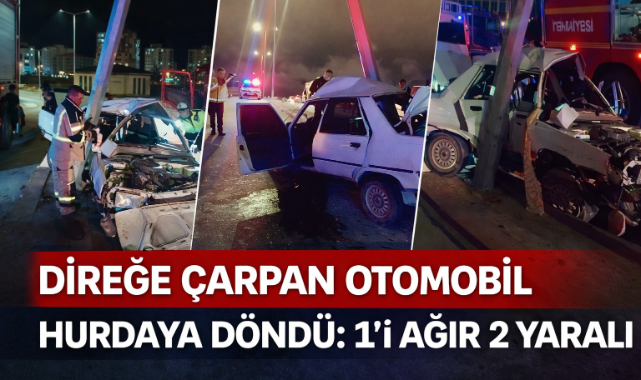 DİREĞE ÇARPAN OTOMOBİL HURDAYA DÖNDÜ: 1'i AĞIR 2 YARALI
