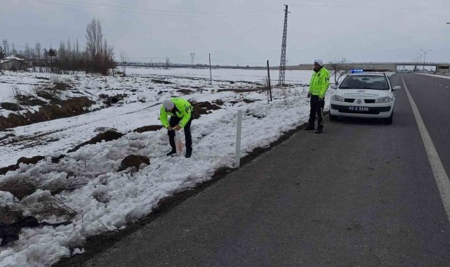 Konya'nın Seydişehir ilçesinde devriye görevi yürüten trafik ekibi yol kenarında gördükleri yavru köpekleri besledi. Ülkenin deprem ile sarsıldığı ve yaraların sarılmaya çalışıldığı şu günlerde Seydişehir Emniyet Müdürlüğüne bağlı ekipler bir yandan deprem bölgesine takviye ekip gönderirken diğer yandan ise ilçede asayişi sağlıyor. İlçede görevlerini sürdüren trafik ekibi de, devriye sırasında Seydişehir-Antalya Çevre Yolu kenarındaki yavru köpekleri fark etti. Hemen ilçe merkezine dönerek ekmek alan trafik polisleri, geri dönerek yaklaşık 10 köpek yavrusunun karnını doyurdu.